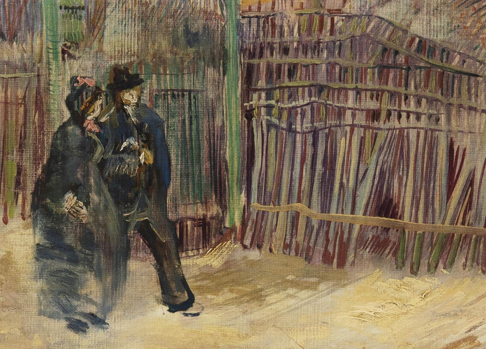 El cuadro pintado en la primavera de 1887, representa a una pareja caminando frente a un centro de ocio de París, un dia de viento. La obra está llena de color y movimiento, el estilo del paisaje marca el giro de van Gogh hacia su conocido estilo impresionista.