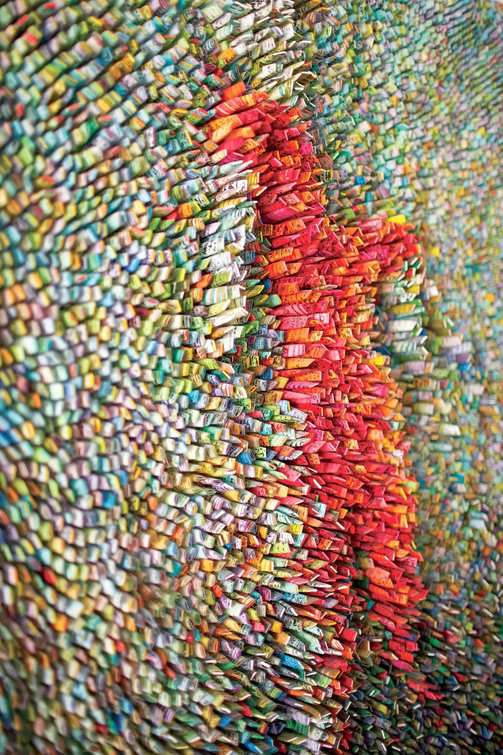 Las esculturas de Ilhwa Kim combinan de forma minuciosa la pintura y la escultura a través de diferentes matices, colores y texturas a partir de papel enrollado teñido a mano. Las bolitas de papel de color resultantes, son dispuestas por la artista surcoreana, en finas líneas que parecen pinceladas sobre un lienzo en blanco. “Al pasar de la pintura a la escultura, quise hacer todo lo que podía hacer en pintura, incluso pinceladas y todas las pinturas de colores amplios. pero me gustaría que mis obras tuvieran una presencia vital mucho más fuerte en el entorno físico como escultura”.